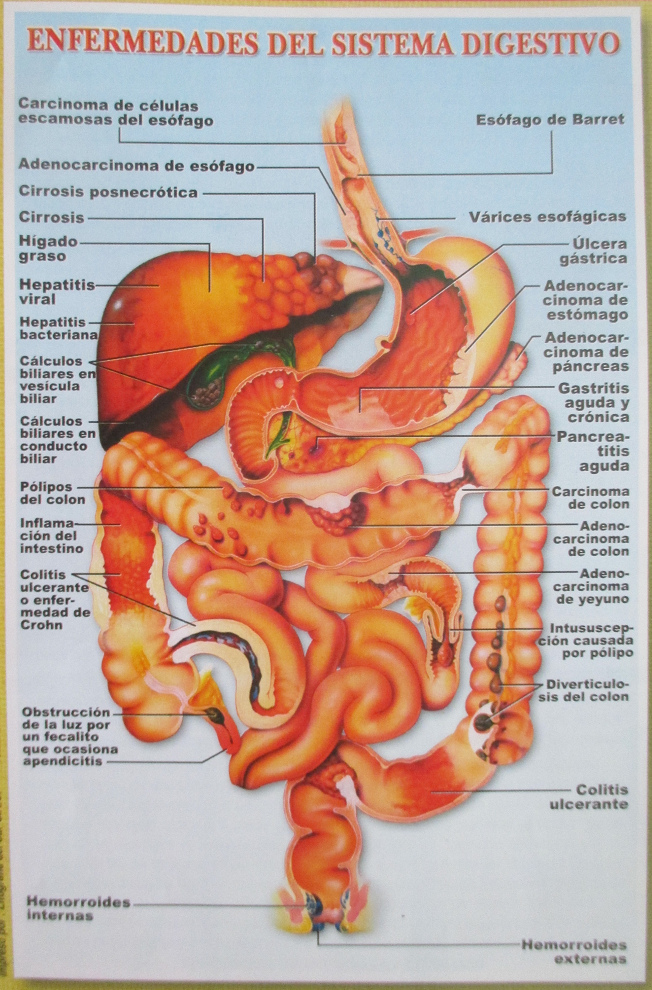 Caries, raíces -- La boca y el esófago -- Gastritis -- Cólera con diarrea y vómitos al mismo tiempo -- Cáncer en cualquier lugar del aparato digestivo -- Parásitos intestinales (helmintiasis) -- Peritonitis - tejido abdominal infectado -- El hígado: hepatitis y cirrosis -- Páncreas: pancreatitis -- Cálculos biliares -- Alarme: apendicitis -- Colon: colitis -- Estreñimiento (constipación) y diarrea -- Diarrea -- Hemorroides