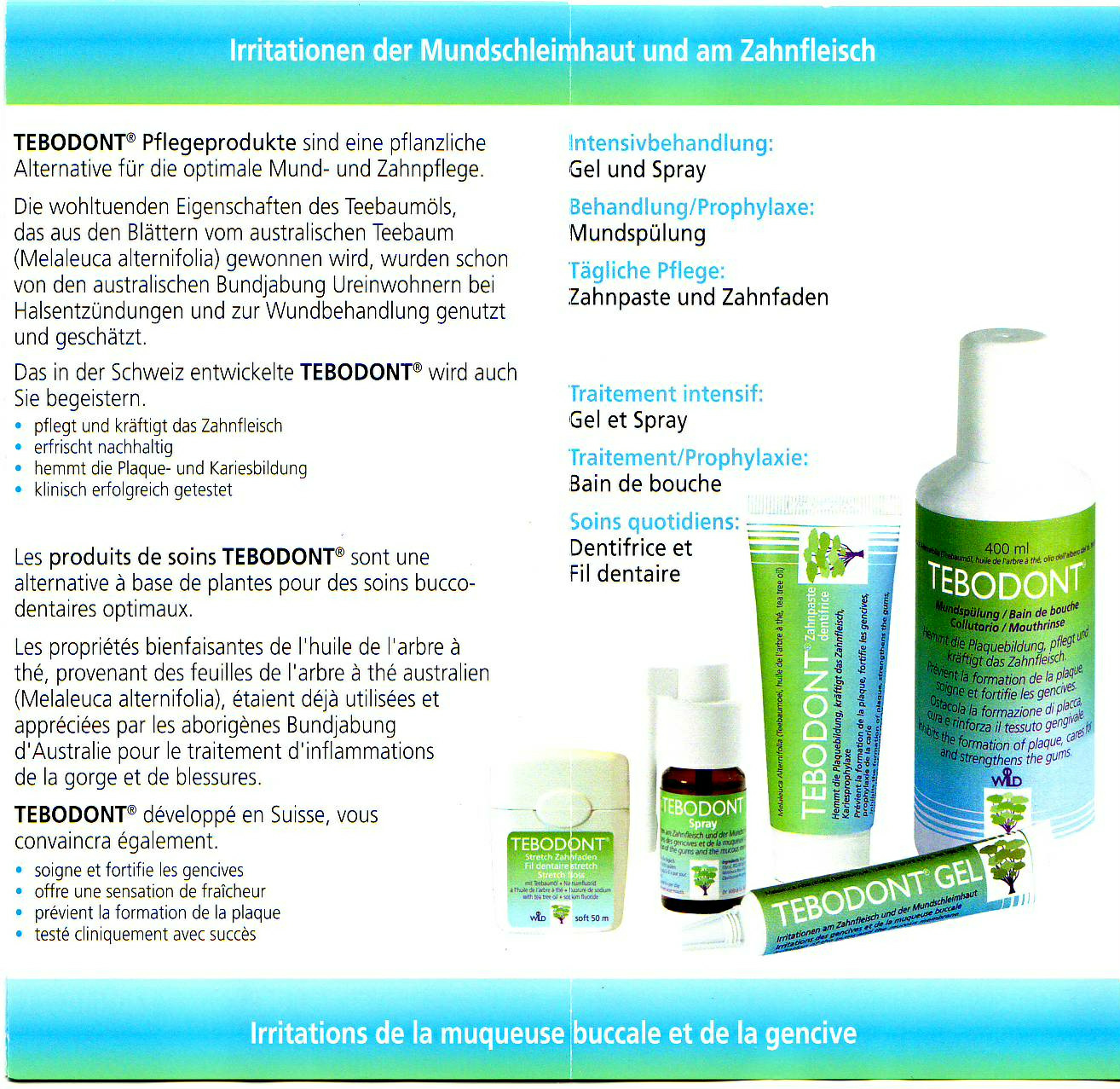 Tebodont-Pflegeprodukte sind eine pflanzliche Alternative für die optimale Mund- und Zahnpflege. Die wohltuenden Eigenschaften des Teebaumöls, das aus den Blättern vom australischen Teebaum (Melaleuca alternifolia) gewonnen wird, wurden schon von den australischen Bundjabung Ureinwohnern bei Halsentzündungen und zur Wundbehandlung genutzt und geschätzt.