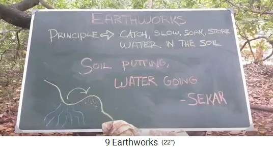 Trockene Hänge werden mit kleinen Gräben und Dämmen wiederbelebt, die bewirken, dass das seltene Regenwasser nicht mehr den trockenen, harten Hang runterfliesst und verlorengeht, sondern ins Erdreich einsickert. Dies ist das Prinzip von Sekar im Permakulturzentrum "Magic House" in Indien: Wasser einfangen, abbremsen, aufsaugen, in der Erde speichern (engl.: "catch, slow, soak, store water in the soil") [web10 - 16-26''].