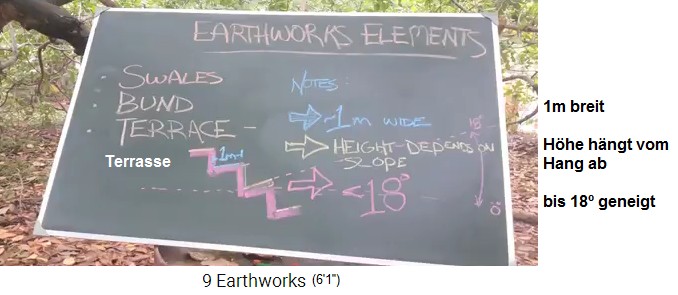 [13,14] Kleiner Graben und Damm am Hang, wo das Regenwasser versickert: Video: 9 Earthworks (10min.): https://www.youtube.com/watch?v=oeAHynOPw-o
