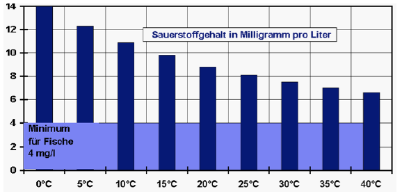 Das einzige Problem bei Gewässern ist deren Wassertemperatur, denn je wärmer sie werden, desto mehr wachsen die Pflanzen und die Tiere, die Sauerstoff verbrauchen, so dass der Sauerstoffgehalt im Wasser sinkt. Im warmen Wasser ist ausserdem grundsätzlich weniger Sauerstoff löslich, so dass der Sauerstoffgehalt dann gleich nochmals sinkt. Pro 10 Grad Temperaturerhöhung verdoppelt sich das Wachstum von Wasserpflanzen und Wassertieren. Und je mehr Nährstoffe im Teich sind, desto trüber ist das Wasser. Ein Teich muss sich also von selbst im Gleichgewicht halten können [web02].