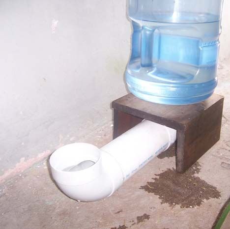 Eine geniale Tränke aus Recyclingmaterial findet man hier mit Flaschen mit einem Eingang und einem Ausgang, die in einem Gefäss stehen: Der Wasserspiegel stoppt den Zulauf ab einer gewissen Höhe: