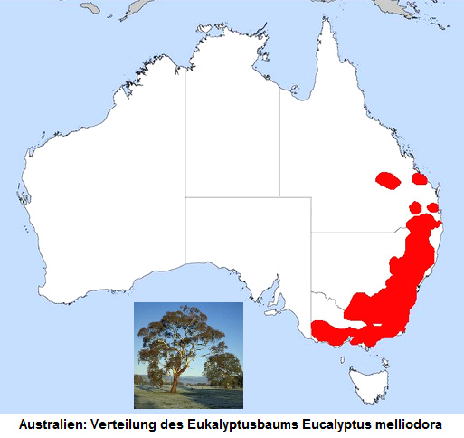 Eukalyptusbaum "Eucalyptus melliodora" [12] - Eucalyptus melliodora, die Blätter und die Blüten [11] - Karte von Australien mit dem Verbreitungsgebiet des Eukalyptusbaums Eucalyptus melliodora [32]