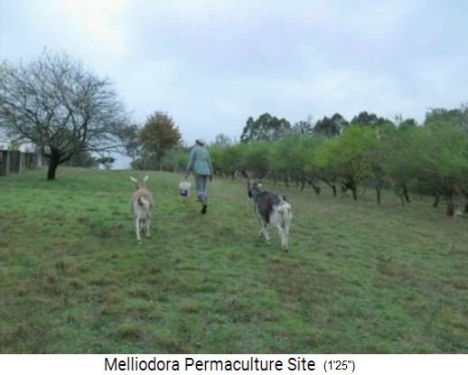 Fruchtbäume auf Melliodora sind: Äpfel, Birnen, Pfirsiche, Pflaumen, Oliven, Feigen, brasilianische Guave (Feijoa), Walnüsse, Mandeln und Haselnüsse. Hühner und Gänse werden in den Obstgarten integriert, Ziegen werden mit elektrischen Zäunen gehalten.