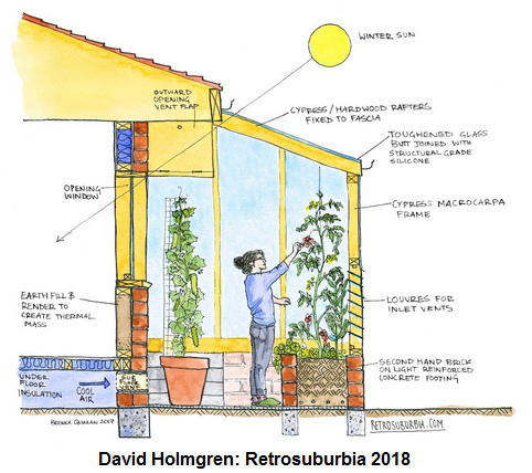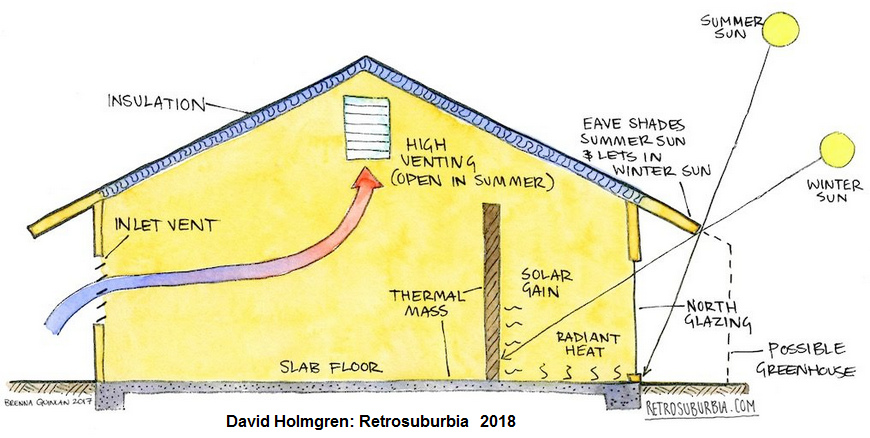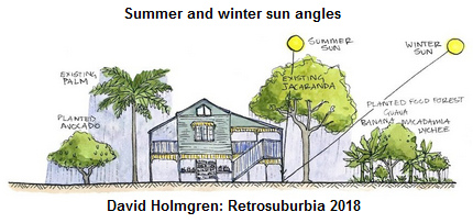 [19] David Holmgren "Retrosuburbia" 2018: Architecture considering summer and winter sun's angle: