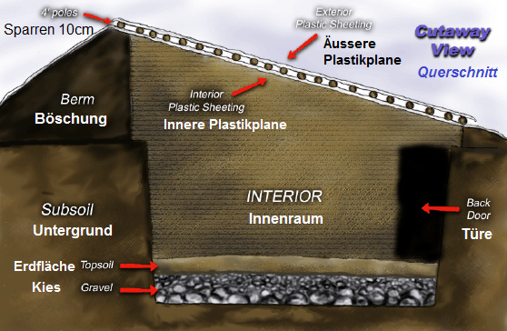Invernadero de fosa completamente bajo tierra, corte transversal, esquema [3] - Invernadero de fosa en un plano con muros gruesos de tierra [4]