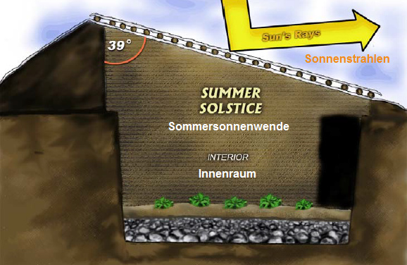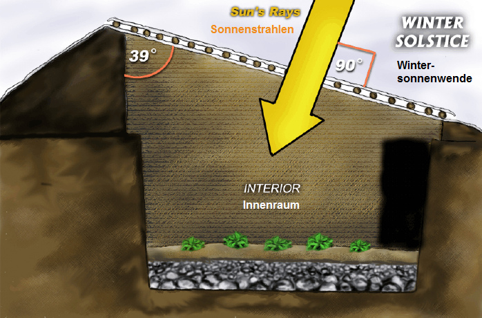 [Eso es FALSO, porque el ángulo de 39 grados es del manual sobre el Walipini de Bolivia. Pero el ángulo es siempre otro según la posición en el planeta. Se ve: lo que importa es la dirección a donde sale el ángulo, pero el ángulo mismo no importa mucho. Más importante son la cantidad de paredes terrestres, y que el invernadero está absolutamente cerrado durante invierno con una ventilación automática].