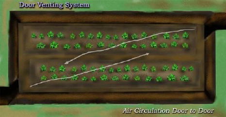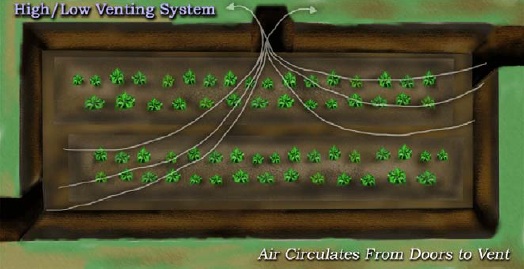 No se olvide la puerta en una pared lateral y una escalera o rampa. Además, en una fosa se necesita una ventilación con unas aberturas en las paredes laterales. Invernaderos de fosa bien desarrollados tienen una ventana en el techo y de esta manera el aire caliente sube y sale automáticamente por el escape.