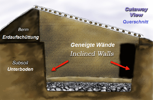 Después se acumula un dique de tierra alto al lado opuesto, y un dique pequeño en el frente (lado de largo, que apunta al sol). Por eso se construye un ángulo con lo cual se puede construir el techo. Para recibir una radiación solar óptima, sale un ángulo de 39 grados.