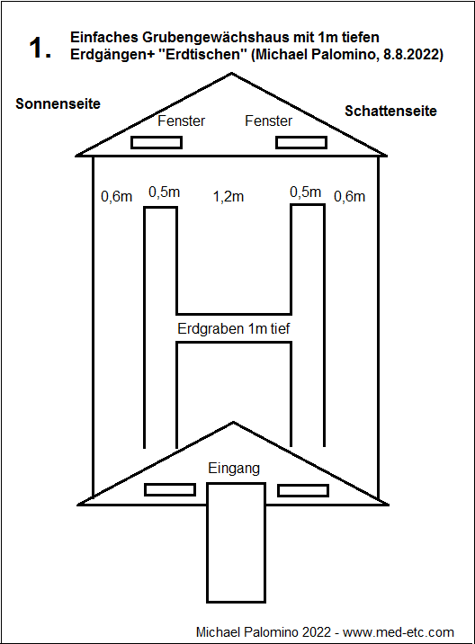 [1] Skizze 1: Einfaches Grubengewächshaus mit 1m tiefen Erdgängen+"Erdtischen": Michael Palomino 2022