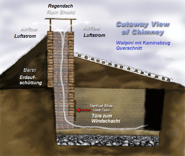 Con este plano de un invernadero de fosa Walipini salta a la vista que las paredes terrestres son dobladas. Principalmente no se necesita eso. Los sacos de tierra apilados son superfluos. Pero aquí han hecho muros con escoria, eso principalmente no se necesita. Pero parece que la meta de esta construcción es de tener un invernadero "sin olor terrestre" y también los sacos de tierra fueron revestidos con yeso.