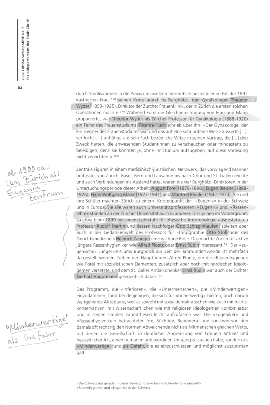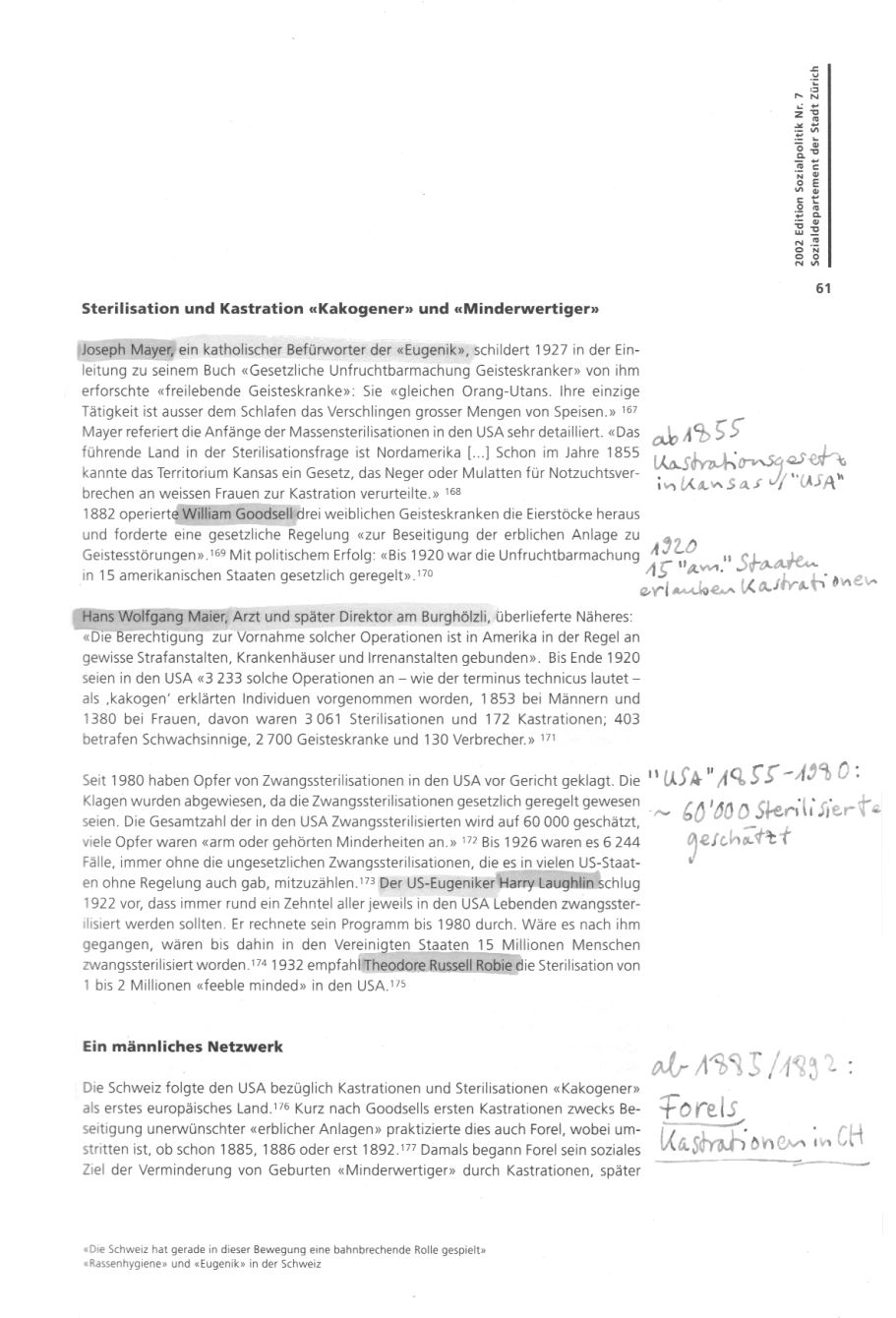 Schon in den bisherigen Zitaten aus Akten und Verlautbarungen der Zürcher Fürsorge finden sich Eheverbote und Hinweise auf amtlichen Druck Richtung Sterilisation, Schwangerschaftsabbruch und Kastration im Zeichen der "Verhütung minderwertigen Nachwuchses". Zum Verständnis dieses Diskurses mit den Leitbegriffen "Eugenik=Rassenhygiene"