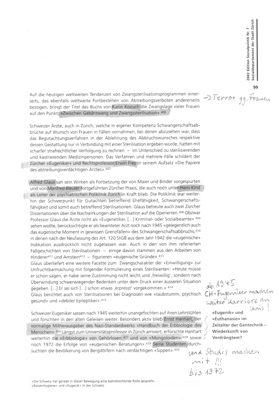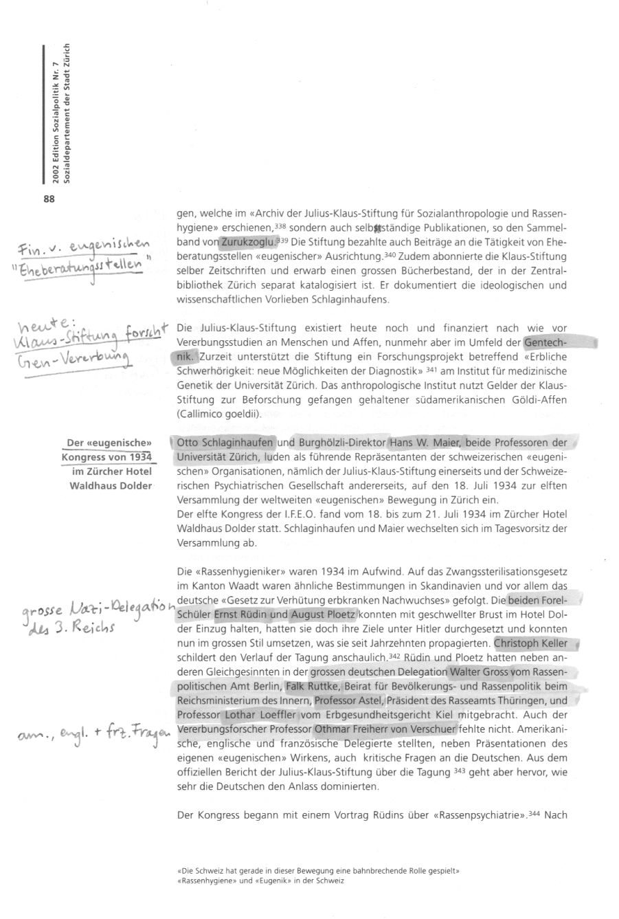 Die schweizer  Erbbiologen zitierten weiterhin Grössen der Naziforschung und forschten in den alten "eugenisch" vorgespurten Bahnen weiter, bis es zu genetischen und gentechnischen Neuansätzen der Forschungen betreffend Erblichkeit und Erbsubstanz kam. Aber auch die Analyse der Risiken dieser neuen Forschung, etwa die Folgen der Verbreitung von genmanipulierten oder über früheren Artenschranken hinweg verbreiteten Krankheitserregern wie Chlamydien, Bakterien, Viren oder Prionen, speziell auch durch deren absichtliche oder versehentliche Implantierung in menschliche Zellen aus Organen, Tumoren oder Embryonen, bleibt alternativen Forschern ohne grosse Geldmittel überlassen. Dies, obwohl die unabsehbaren Möglichkeiten der neueren Medizintechnologien und die Perspektiven der Gentechnik die ethische Problematik der "Eugenik" um zahlreiche neue Aspekte vor dem alten Hintergrund erweitern.
