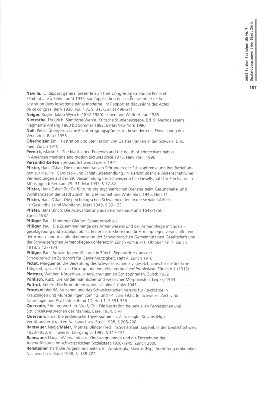 Thomas Huonker: "Fürsorge" in Zürich 1890 bis 1970; Sozialdepartement der Stadt Zürich 2002, S. 187