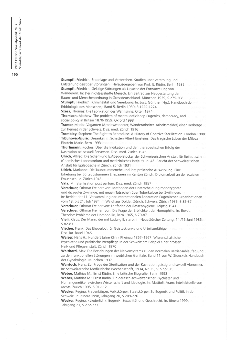 Thomas Huonker: "Fürsorge" in Zürich 1890 bis 1970; Sozialdepartement der Stadt Zürich 2002, S. 190