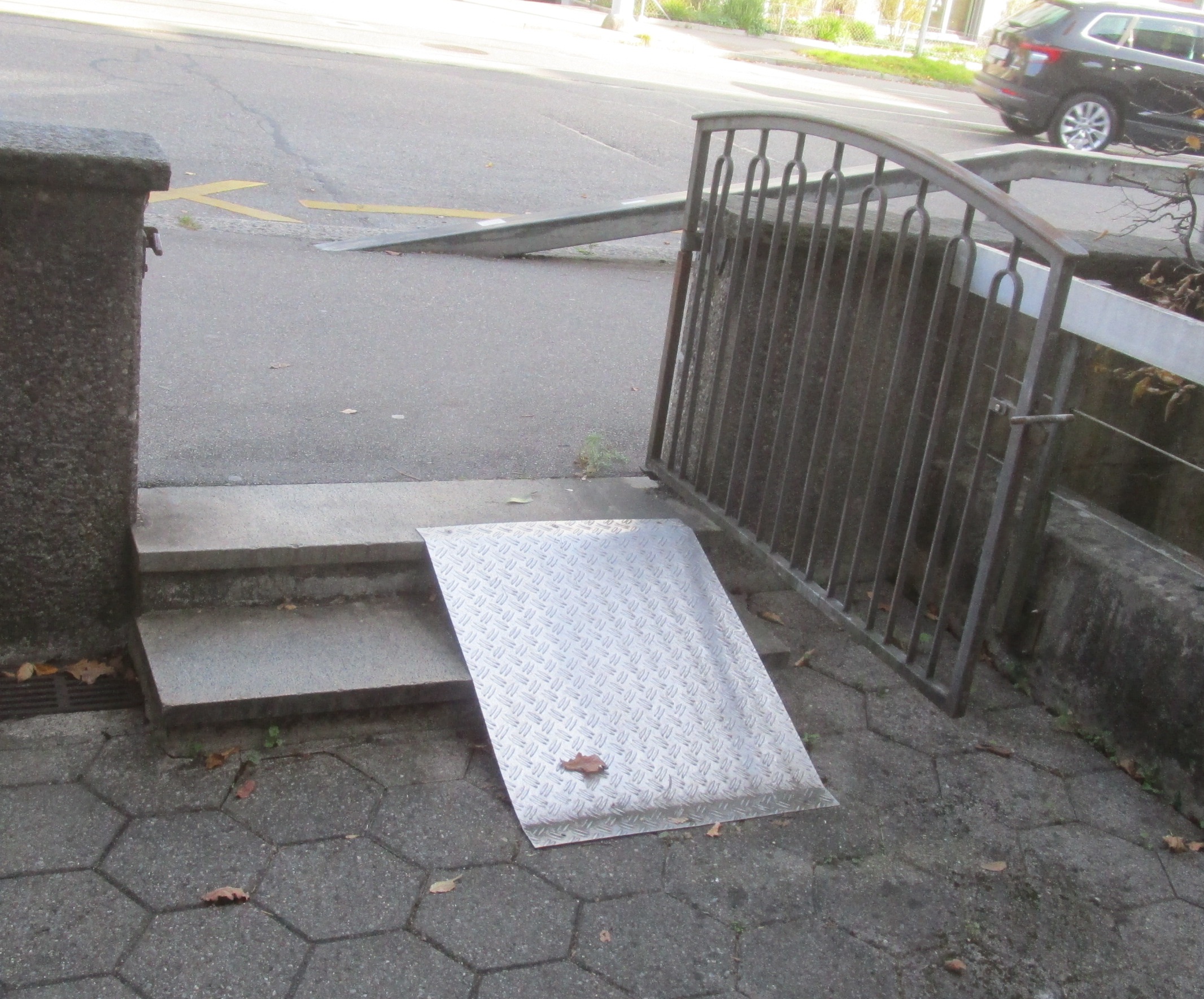 -- Rollstuhlrampen rahmen die Treppe ein, Riffelbelag
