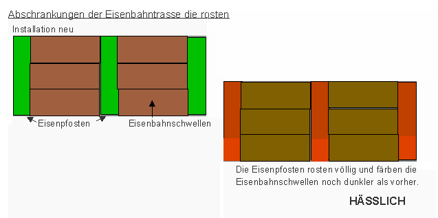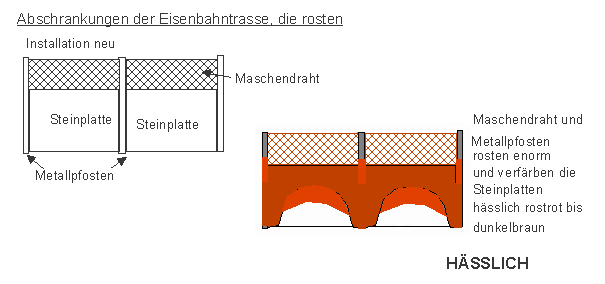 ![]() Abschrankungen der Eisenbahntrasse, die rosten. Beispiel: Tessin (Schweiz). |