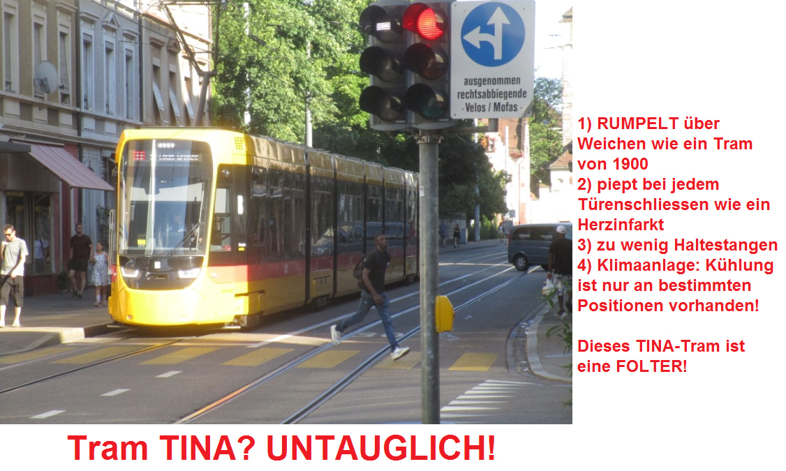 | Trams UNTAUGLICH: alte Trams mit hohem Einstieg Trams aus den 1950-er Jahren, die durch hohen Einstieg bis heute allen Kinderwagen, Gehbehinderten und RollstuhlfahrerInnen das Benutzen des öffentlichen Verkehrs unmöglich machen: im Auto-Kopf-Zürich: Pullman-Trams fahren dort bis heute..., sind absolut UNTAUGLICH (Beobachtung Palomino). Trams UNTAUGLICH: Das TINA-Tram von Stadler Rail (2024): rumpelt über Weichen wie ein Tram von 1900 - piept wie gestört - zu wenig Haltestangen - Klimaanlage kaum vorhanden Zuerst verkaufte Stadler Rail in der Schweiz ein tolles Tram "Tango", das war TOP, und seit 2024 ein defektes Tram "TINA", ist 1 FLOP. ![]() Trams UNTAUGLICH: Das TINA-Tram von Stadler Rail (2024): 1) rumpelt über Weichen wie ein altes Tram "Tante Schuggi" - 2) piept wie gestört wie ein Herzinfarkt bei jedem Türenschliessen - 3) zu wenig Haltestangen - 4) Klimaanlage kaum vorhanden Man fragt sich ausserdem, wieso der Stromabnehmer VERKEHRT gesetzt ist. E-Mail vom 2.7.2025 Hallo Stadler Rail, Sehr geehrte Damen und Herren, es stellt sich bei Fahrten mit dem TINA-Tram auf dem BLT-Netz heraus, im Sommer -- funktioniert die Klimaanlage im Tango-Tram EINWANDFREI -- funktioniert die Klimaanlage im TINA-Tram SCHLECHT BIS GAR NICHT bzw. es gibt nur gewisse Positionen im TINA-Tram, wo überhaupt eine angenehme Kühlung stattfindet. Vorschlag -- weiterhin Tango-Trams verkaufen, denn der Tango ist TOP -- ALLE TINA-Trams VERSCHROTTEN und durch schöne Tango-Trams ersetzen, denn das TINA-Tram ist FLOP, denn es gibt einfach zu viele Mängel am TINA-Tram: 1) Rumpeltram TINA 2) zu wenig Haltestangen 3) Herzbaracken-Piepsen bei jedem Türenschliessen 4) praktisch ohne Klimaanlage Das TINA-Tram ist eine Fehlkonstruktion und braucht es wirklich nicht, ist überflüssig. -- die "lachenden Lampen" vorne sind pure VERARSCHUNG - und jedes Mal, wenn ein TINA-Tram kommt, denkt man an den Tango, der so viel besser ist als das Lumpen-TINA-Tram. Freundliche Grüsse Michael Palomino NIE IMPFEN - GA-Fahrer Geschichte - Soziologie - Naturmedizin |