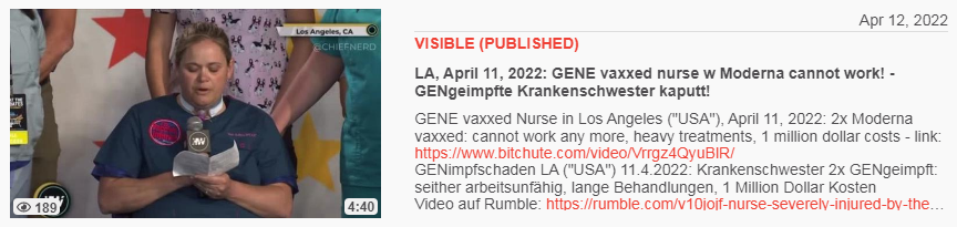 Video vom 12.4.2022: LA, April 11, 2022: GENE vaxxed nurse w Moderna cannot work! - GENgeimpfte Krankenschwester kaputt!