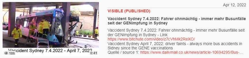 Video vom 12.4.2022: Vaccident Sydney 7.4.2022: Fahrer ohnmächtig - immer mehr Busunfälle seit der GENimpfung in Sydney