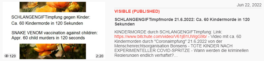 Video vom 22.6.2022: SCHLANGENGIFTimpfmorde 21.6.2022: Ca. 60 Kindermorde in 120 Sekunden